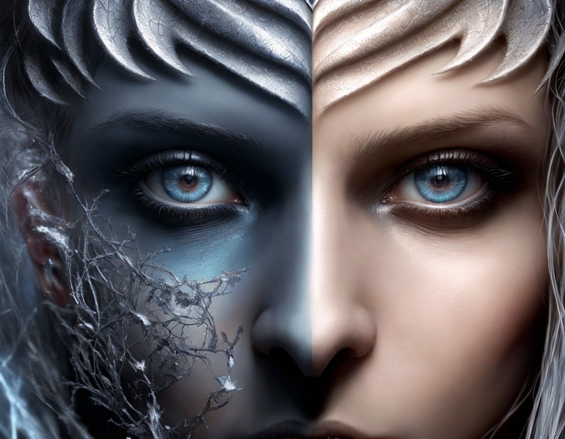 Tomasz Alen Kopera, Jean-Paul Monge, Tom Bagshaw, Imagine a character from the game Of Light And Darkness created by Gil Bruvel. Fantasy. Magic. Photorealistic. Very intricate pattern. Black metal. Digital painting. Sharp focus. Deep blue eyes. H. R. Giger. Very inticate. fractal. Filigree