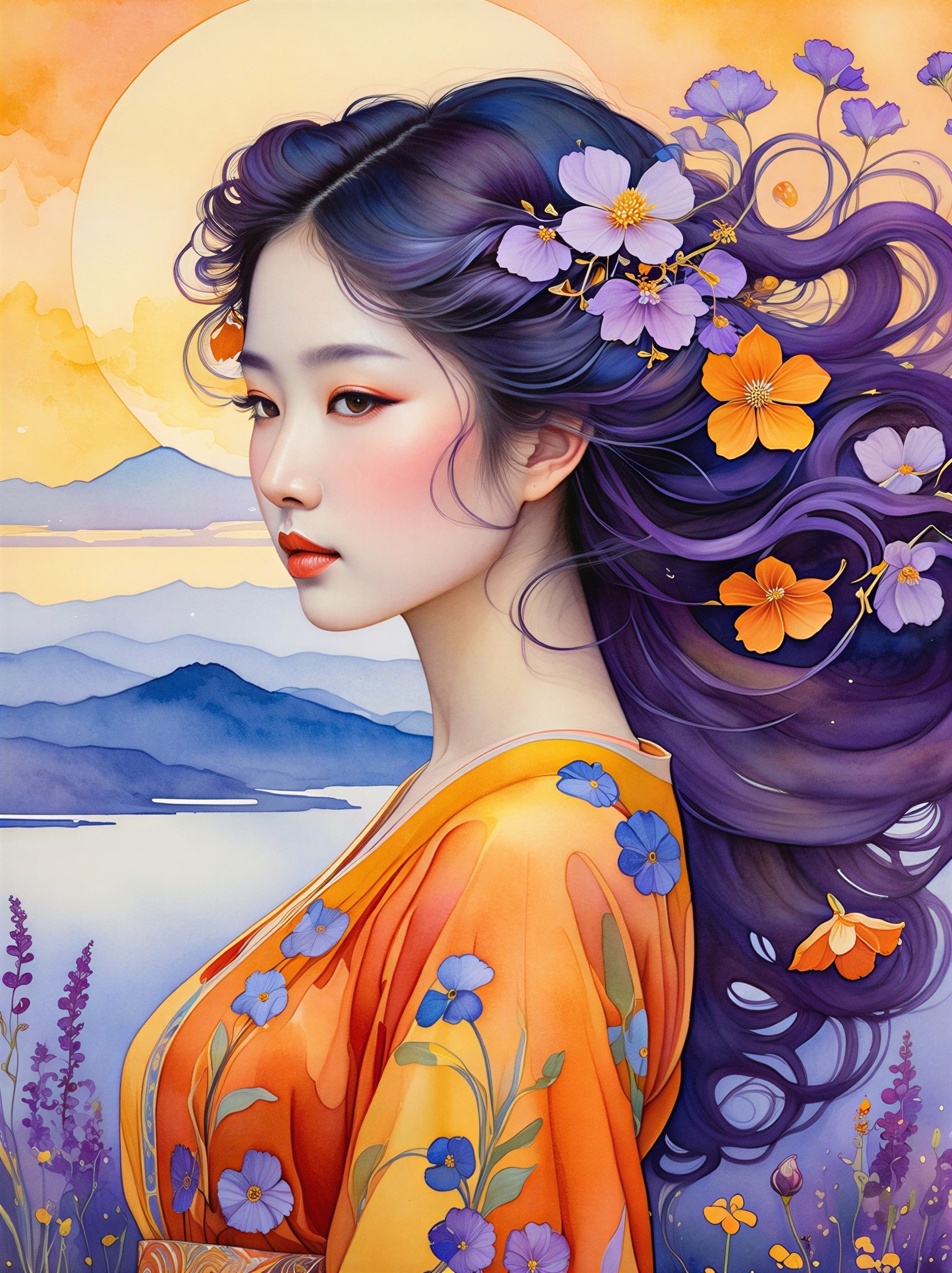 A serene portrait of a young woman in a vibrant orange kimono adorned with flowers. Her flowing, purple hair cascades around her, set against a dreamy landscape and soft pastel hues.