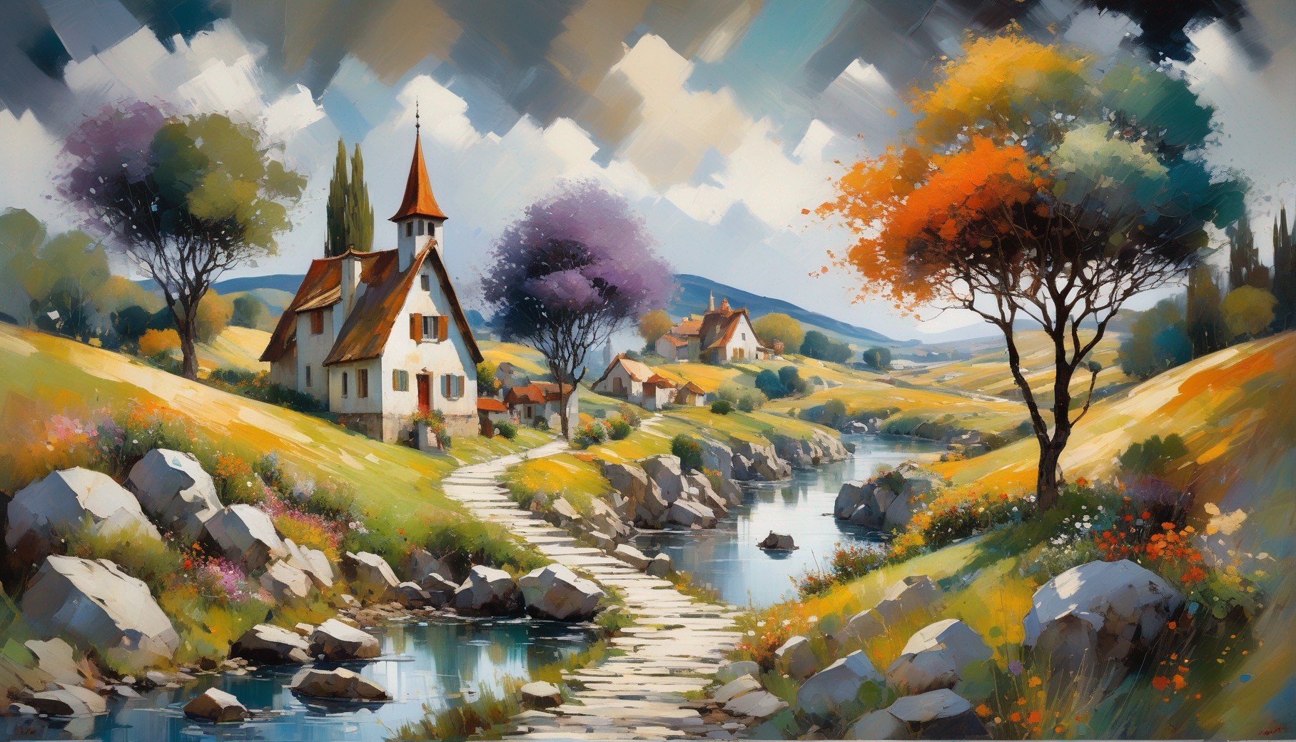 A vibrant painting of a picturesque village with a winding path, river, blooming flowers, and lush trees under a sunny sky.