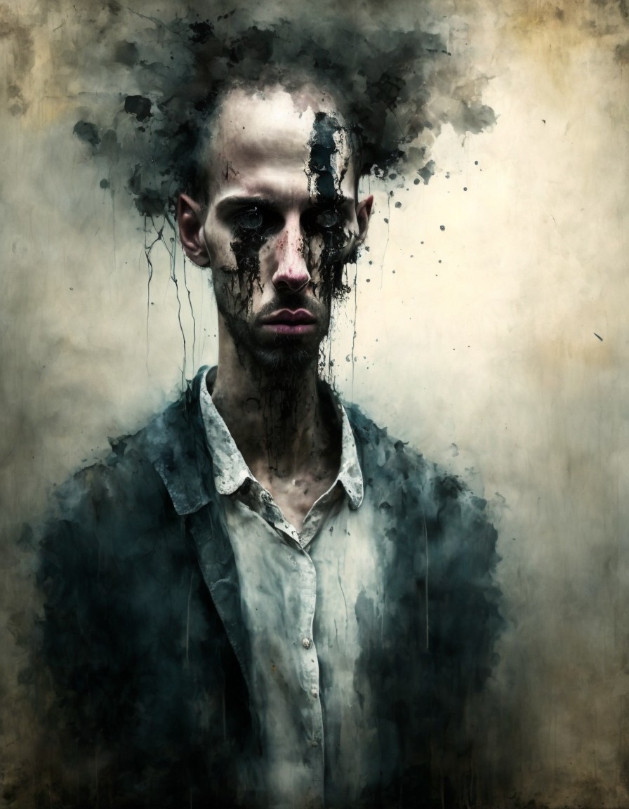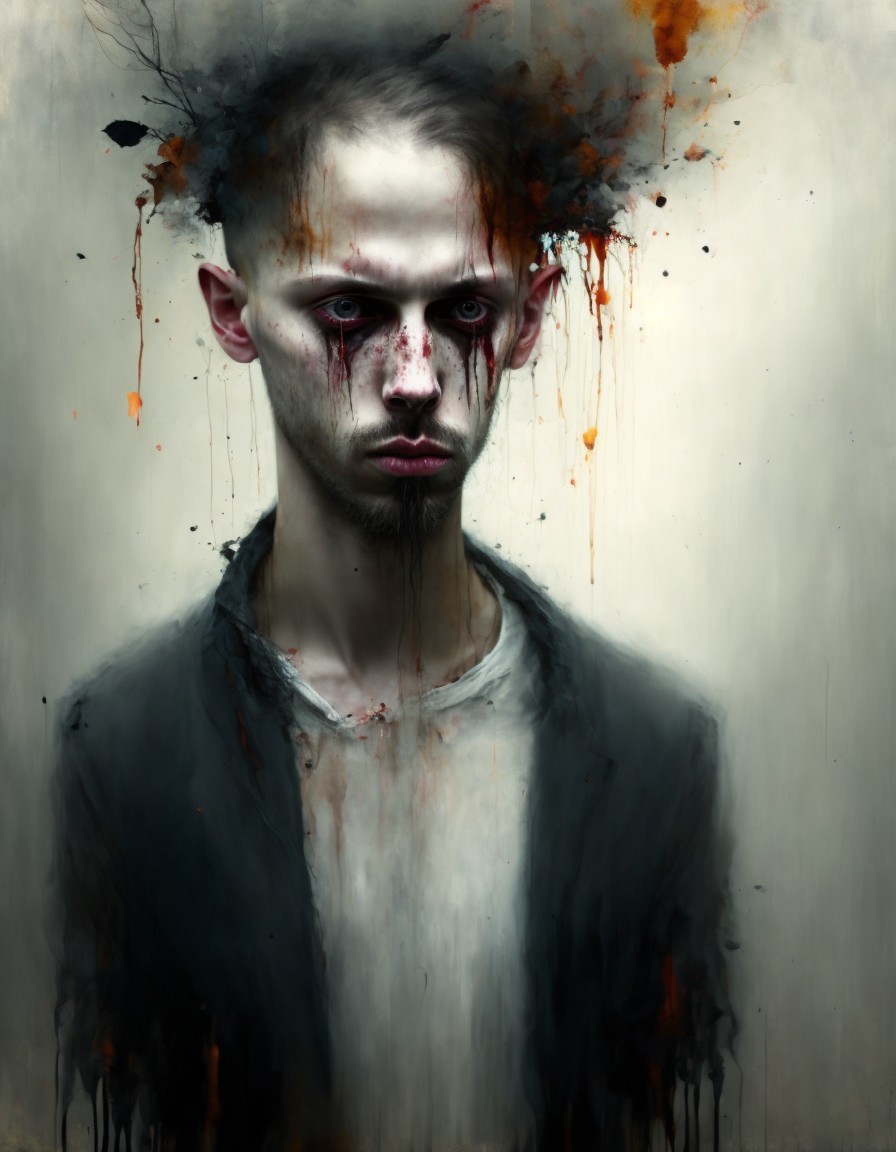A haunting image of a person with a ghostly pallor, dark eyes, and splattered red markings simulating blood, set against a murky background.