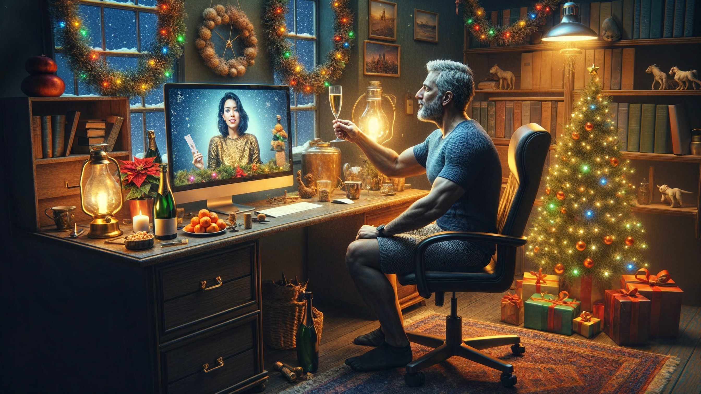 A man sits in a cozy, festively decorated home office, raising a glass to a woman on his computer screen. The scene is warm and inviting, filled with holiday lights and decorations. All images are copyrighted by © ZhV. Made by Artificial Intelligence (AI). Please do not use my images as a starter, use the "Try" button. Do not use the original hint text: change the sentences and text, put in at least a little of your work. This will be respect for my work, my images. I spend too much time creating images, so if you liked the image, do not be lazy to like it or leave a comment. If you copy my original text, then make a note that the author of the text is © ZhV. Thank you for your attention and understanding! With respect. ZHV!!!