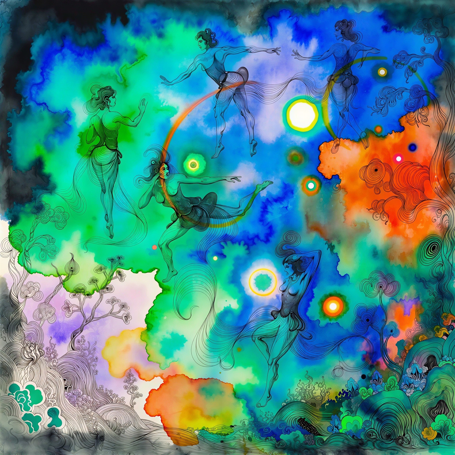 An intricate, textured, vibrant watercolor and linework masterpiece depicts several graceful young women dancing in motion against a dreamy, abstract backdrop of evolving colors and organic shapes. The women are drawn in delicate black lines against a richly colored, swirling background of deep blues, greens, and touches of orange. The background