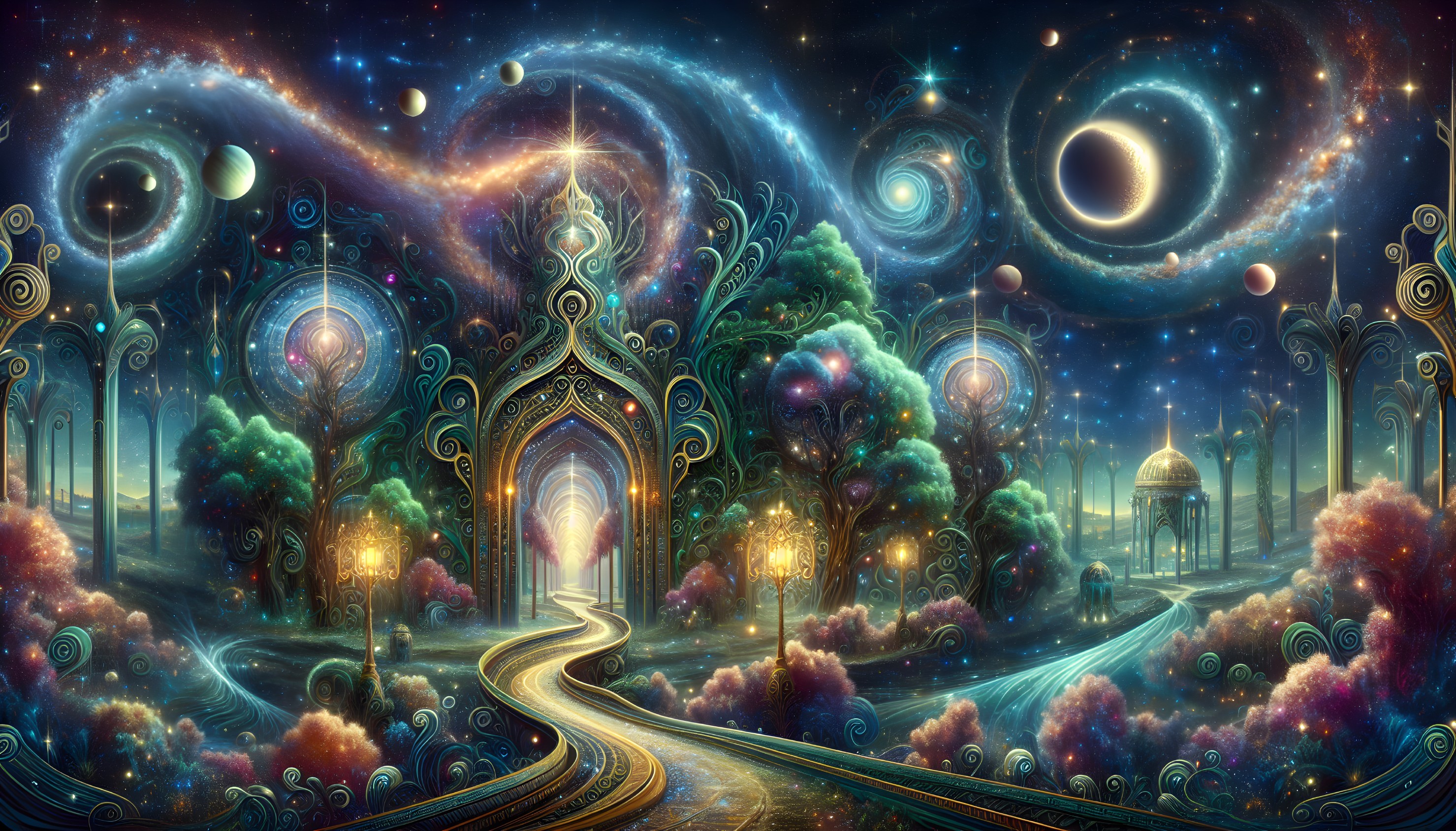 A mesmerizing cosmic landscape features swirling galaxies and ethereal trees, with ornate archways and glowing paths leading through a vibrant, dreamlike world filled with stars and mystical elements.