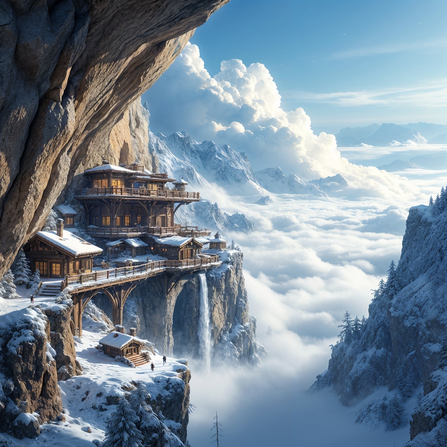 A majestic mountain retreat nestled among snowy peaks and clouds, featuring a stunning wooden structure with a dramatic waterfall flowing beside it, evoking tranquility and adventure.