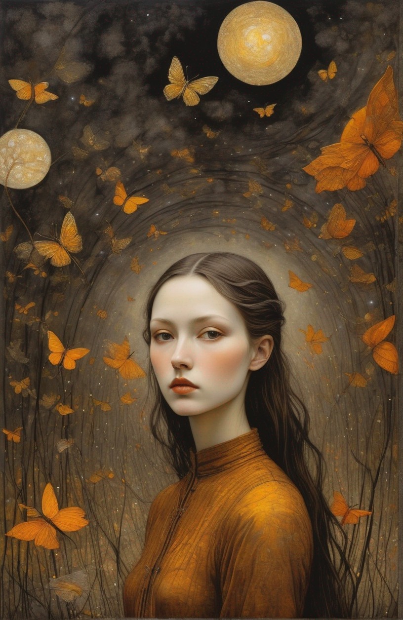 A woman with a serene expression is surrounded by glowing butterflies against a dark, enchanted forest backdrop, evoking a mystical aura.
