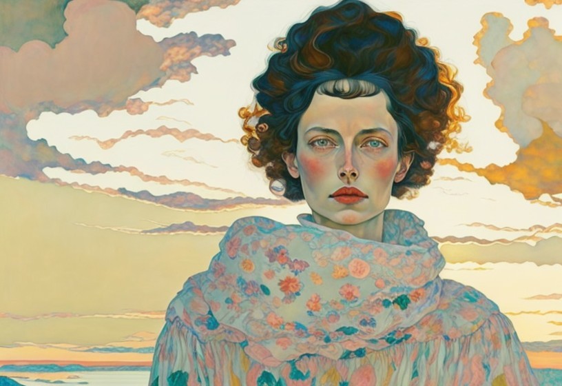 A serene woman in a flowing dress and wide-brimmed hat sits against a backdrop of clouds and twilight sky.
