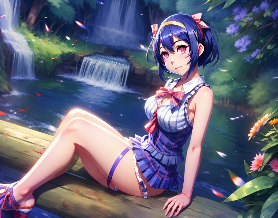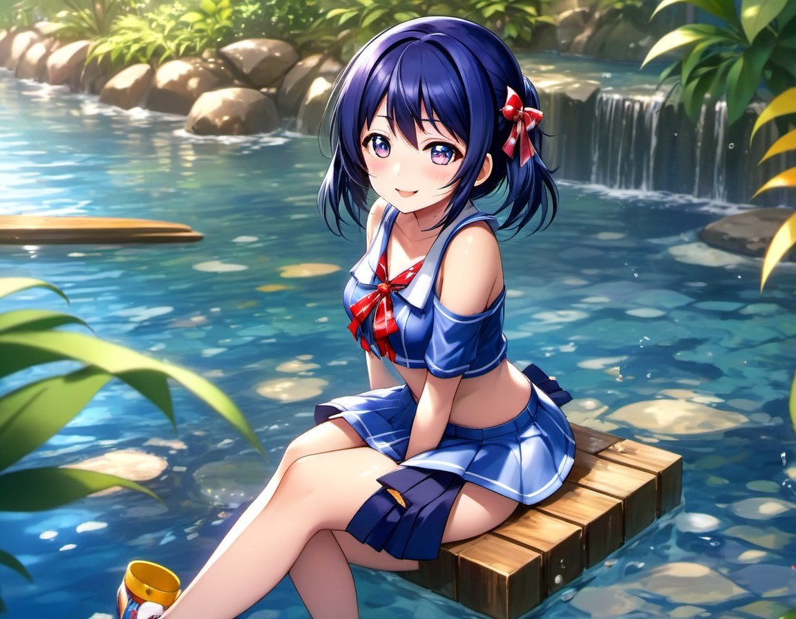 A cheerful anime girl with short blue hair, wearing a dark blue swimsuit with a red bow, sitting by a pool on a sunny day.