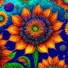 A vibrant, colorful illustration of sunflowers with bold yellow and orange petals, featuring intricate blue and green details in the center, set against a bright blue background with swirling patterns.