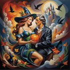 A romantic scene featuring a couple sharing an intimate moment against a dramatic sky. The woman wears a flowing gown, while the man is in a dark cloak, surrounded by crows and autumnal elements.