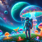 An astronaut in a spacesuit walking on a winding path through a magical, bioluminescent mushroom forest at night, with a gigantic, glowing blue full moon in the dark sky, surrounded by tall pine trees and a vibrant nebula, with a large, colorful mushroom decorated with beads and charms to the left,