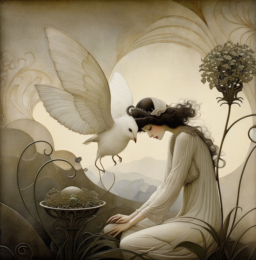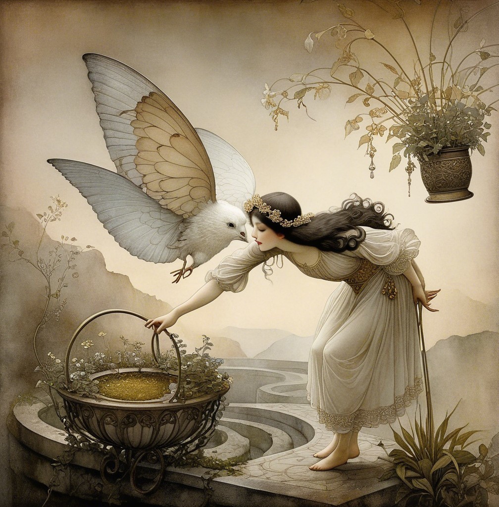 The image features a graceful figure with a delicate mask adorned in intricate gold designs. Her ethereal face contrasts against ornate patterns, evoking a sense of elegance and mystery.