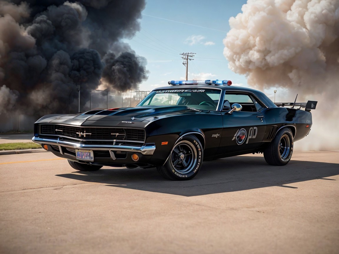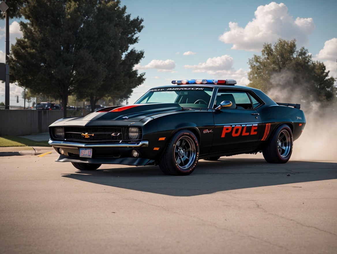 A sleek black classic Camaro powers down a city street, creating a cloud of tire smoke. Onlookers watch as the muscle car showcases its impressive performance in the lively urban setting.