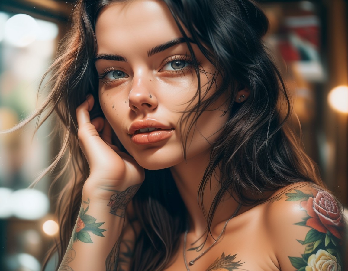 A woman with striking eyes and tattoos poses, with her hand in her hair, in a room with blurred background.