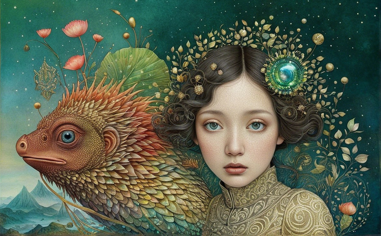 A surreal portrait features a young girl with intricate, leafy hair and a mystical creature beside her, all set against a vibrant, dreamlike background.