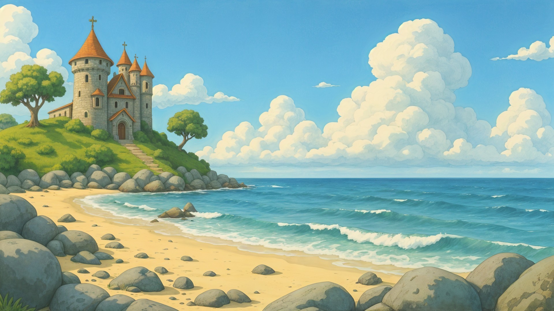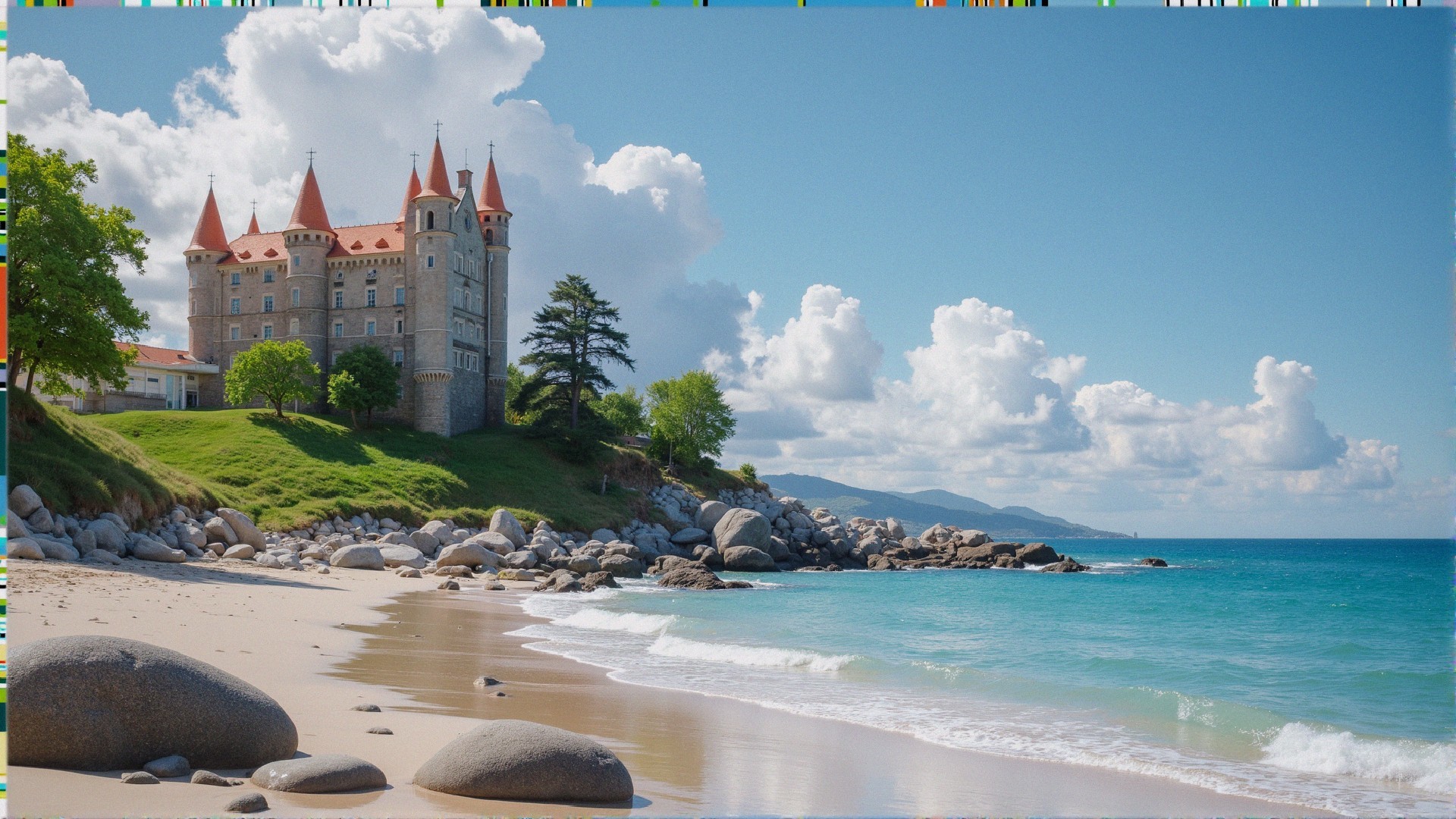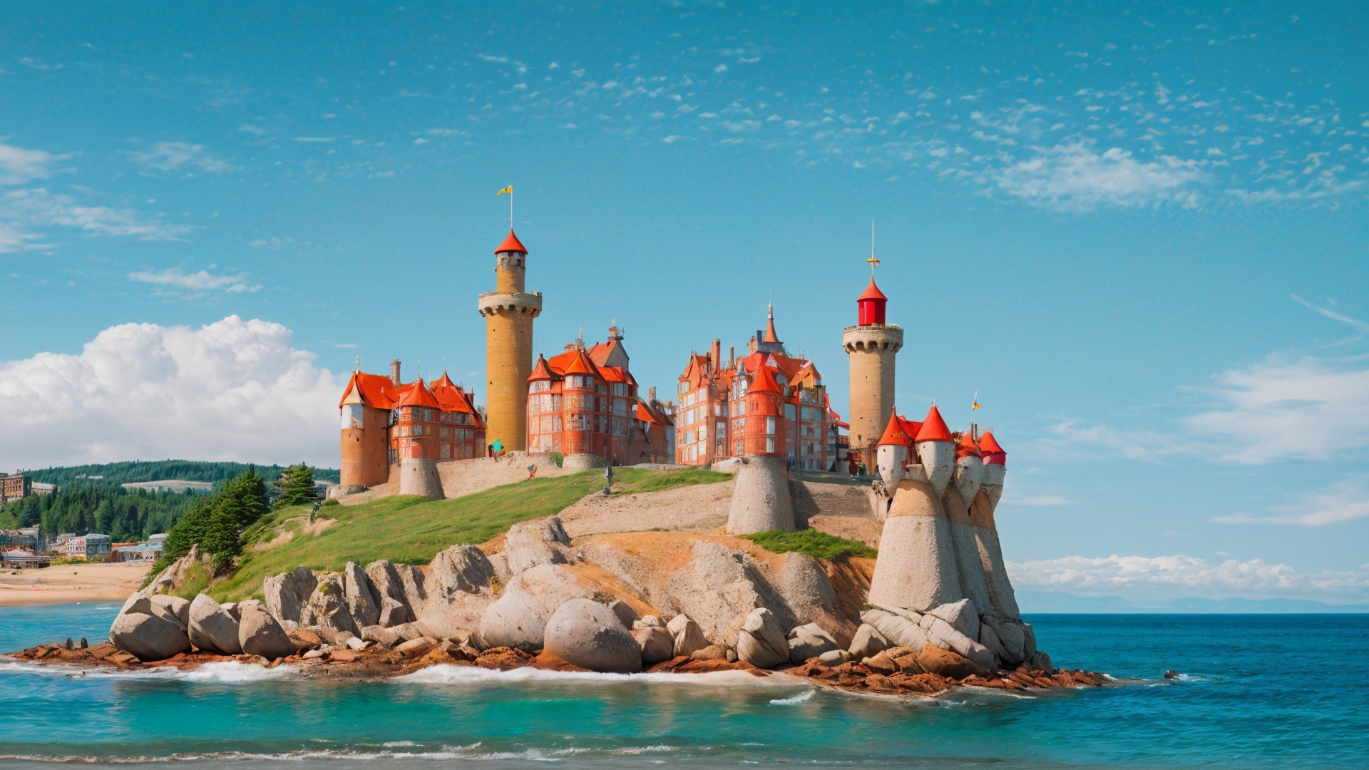 A majestic castle with red roofs and a tall tower stands on a lush island, surrounded by turquoise waters and a sandy beach, under a bright blue sky with fluffy clouds.