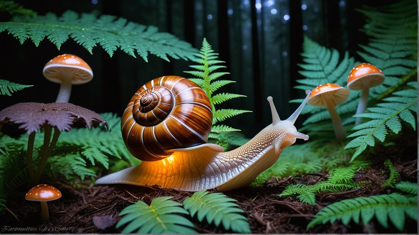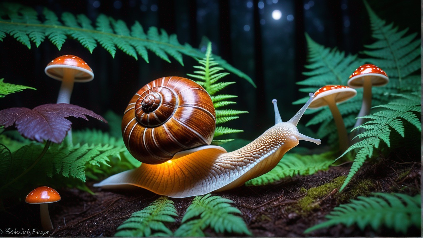 A vibrant snail with a glossy shell crawls among ferns and glowing mushrooms under a night sky with a visible moon.