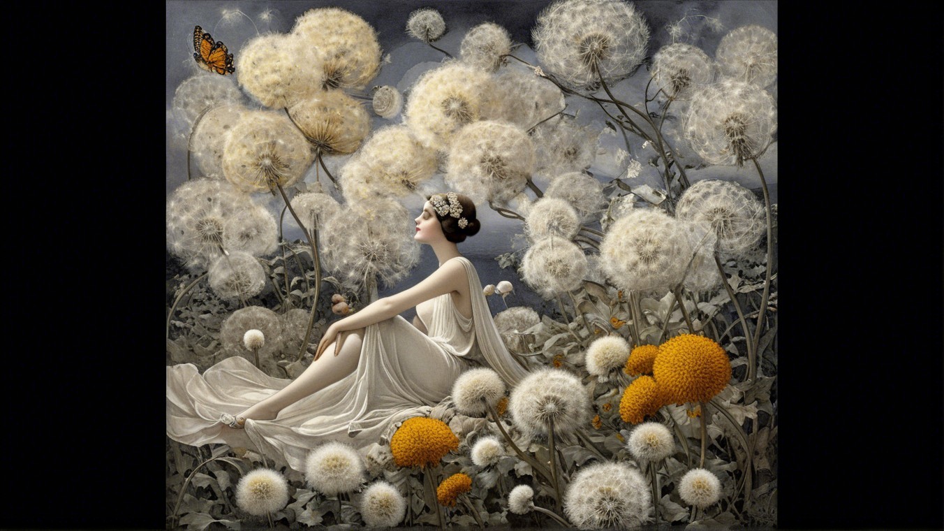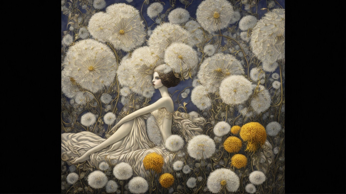 A serene woman in a flowing dress sits amidst large, stylized dandelions and vibrant yellow flowers, creating a whimsical, dreamlike atmosphere. The background is deep and dark.