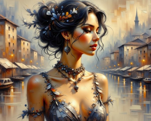 A stunning model with voluminous red curls, wearing elegant gold and red jewelry. Her makeup features bold lips and striking eyes, enhancing her glamorous look against a soft gray background.