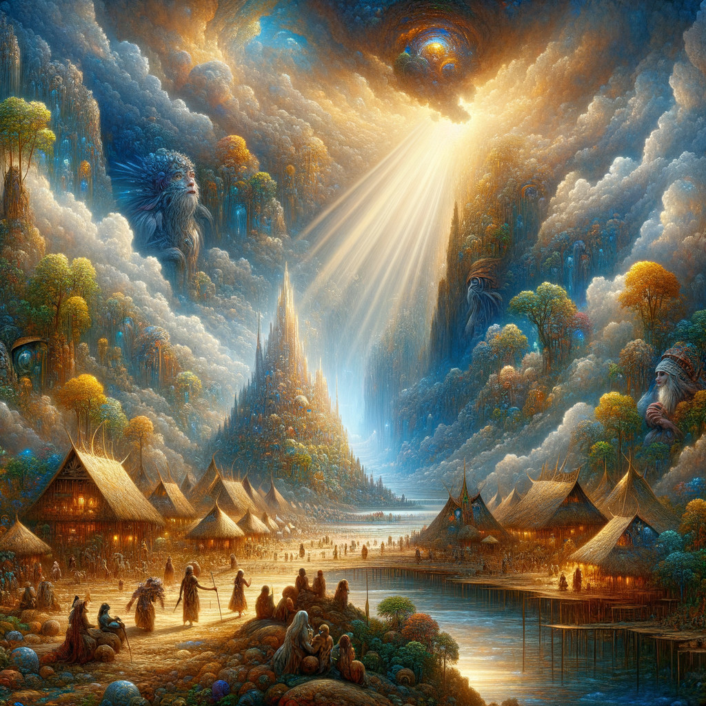 A vibrant tropical scene with lush greenery and towering cliffs, featuring traditional huts and boats along a serene river, illuminated by radiant sunlight filtering through the canopy.