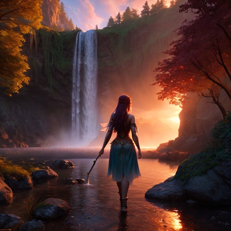 A fairy with purple hair gazes at a sunset by a majestic waterfall amidst a vibrant, enchanted forest.
