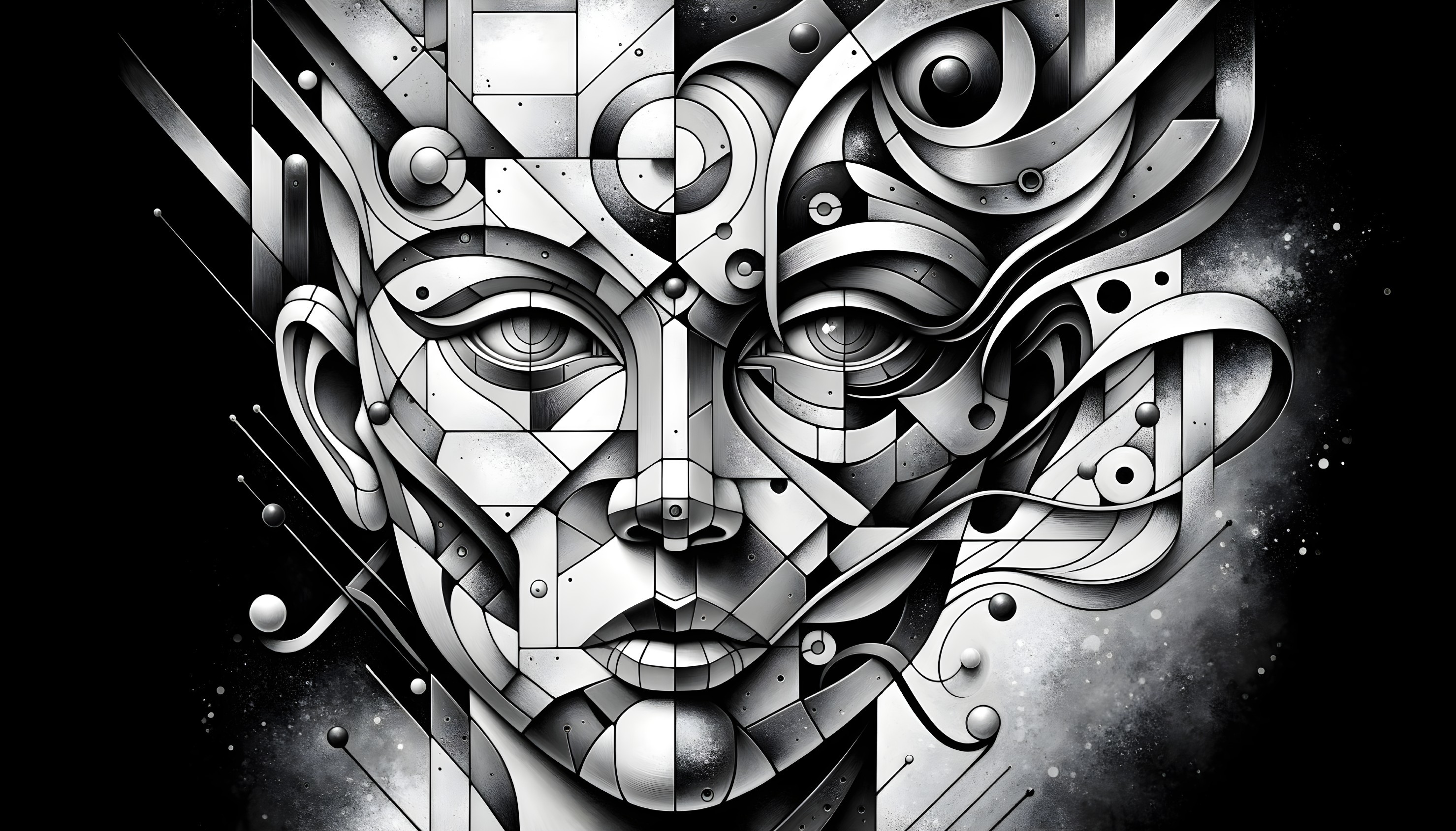Monochromatic abstract face with geometric and swirl patterns, resembling a futuristic or artistic interpretation of a human visage.