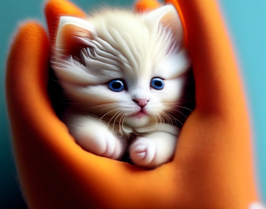A digital artwork of a cute, white kitten with bright blue eyes, nestled cozily in blue gloves against an orange dotted background.