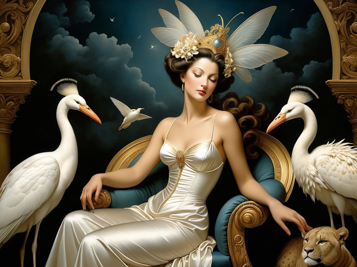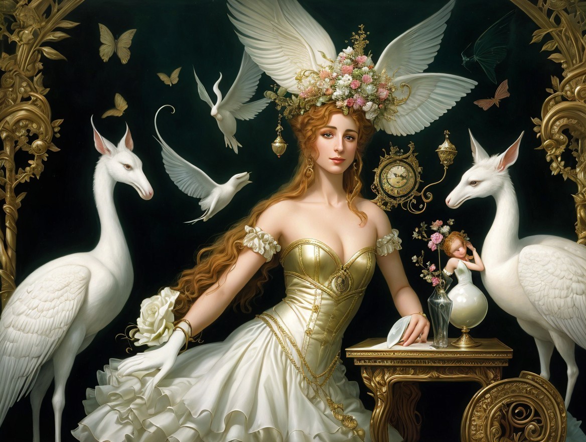 A serene woman in an elegant white gown adorned with a golden crown sits gracefully among white birds and a small deer, surrounded by intricate ornamental designs. The scene exudes tranquility and beauty.