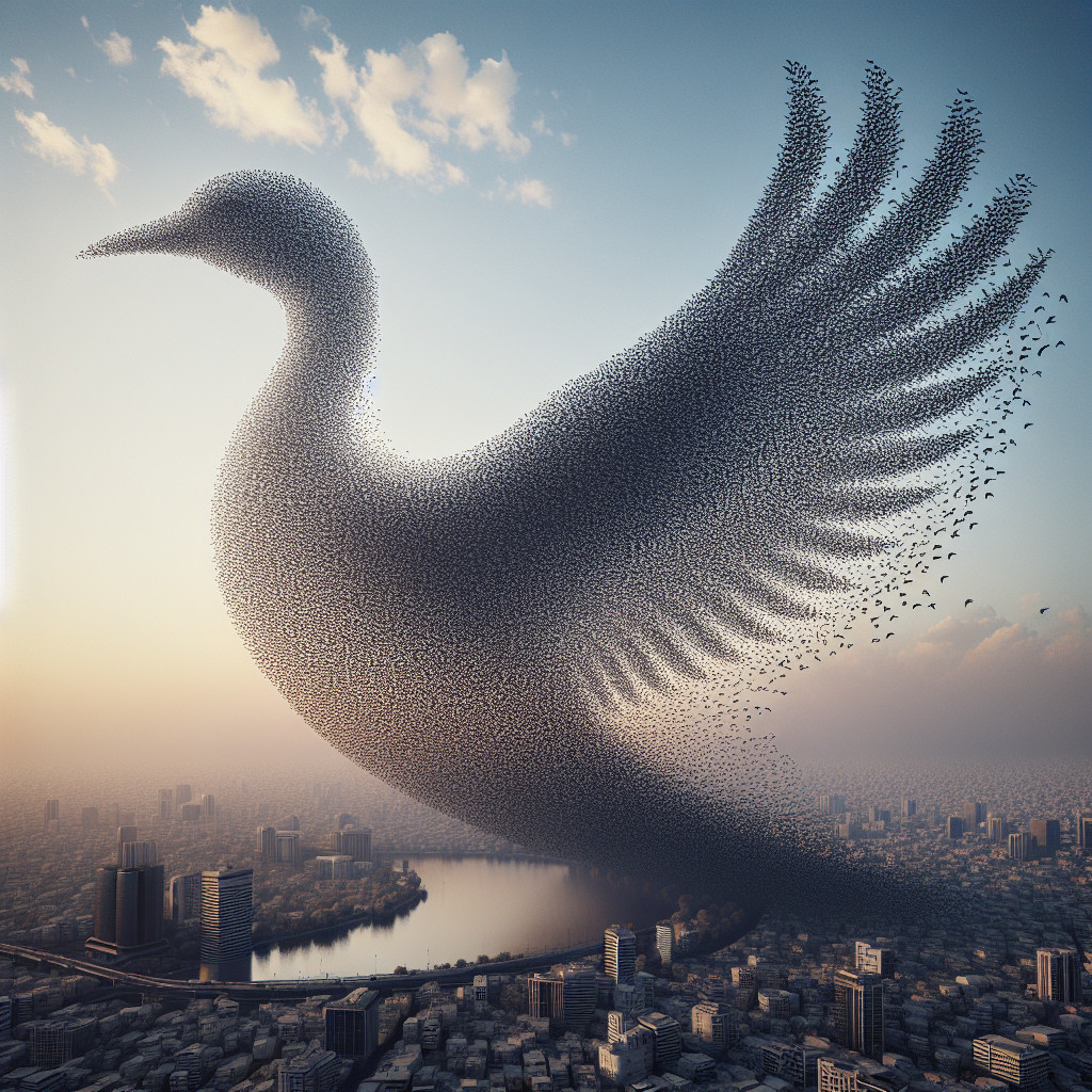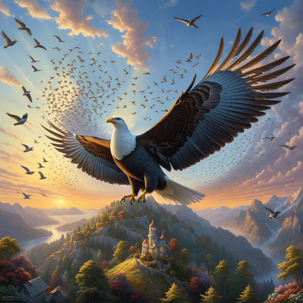A majestic swan soars over a serene lake surrounded by autumn trees, while flocks of birds fill the colorful sky at sunset, creating a peaceful and picturesque landscape.