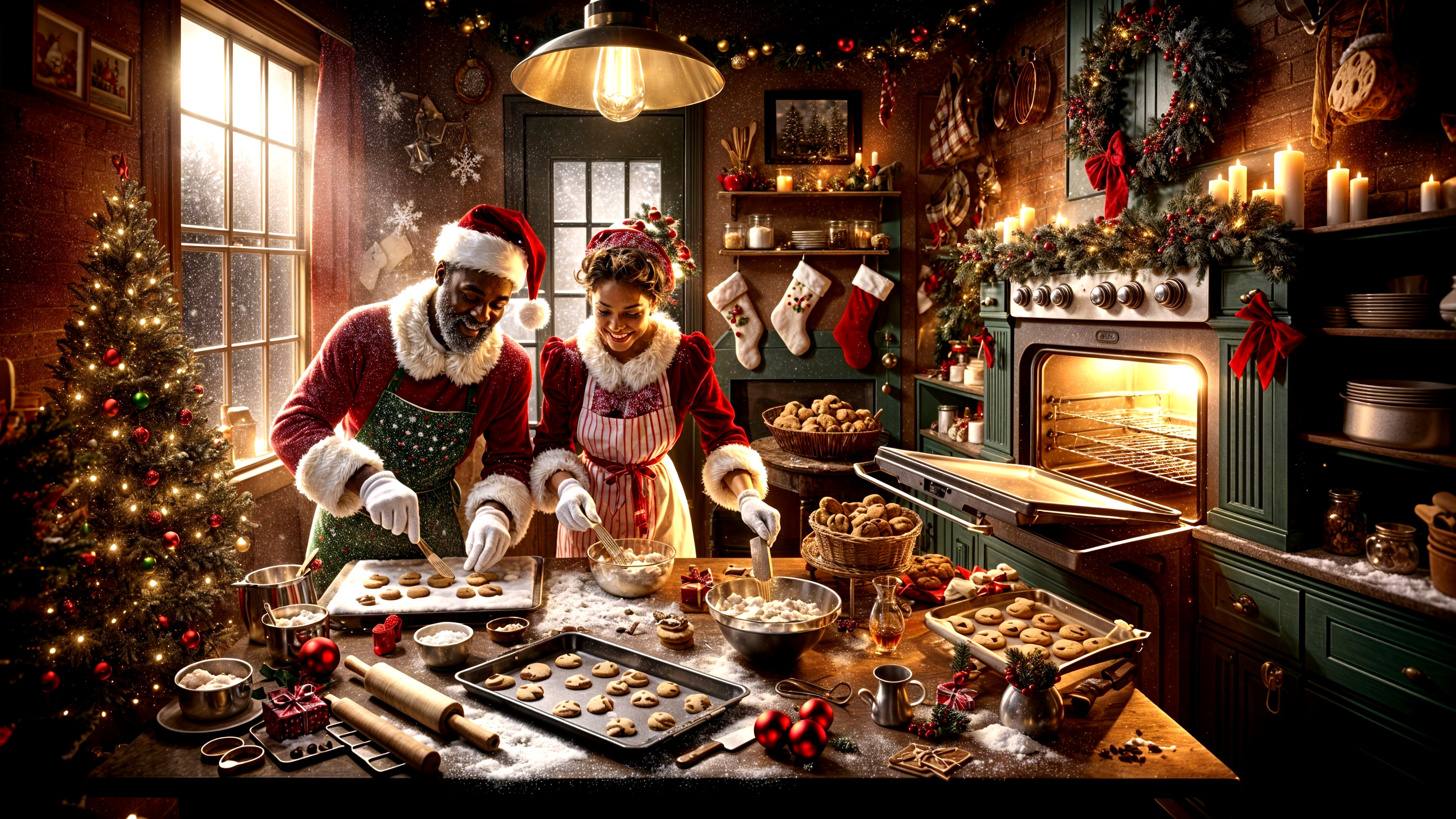 Warm and cozy kitchen scenes capture a festive atmosphere with a couple in traditional Santa outfits baking cookies. Flour dust fills the air, while joyful expressions and rich colors create a heartwarming holiday vibe.