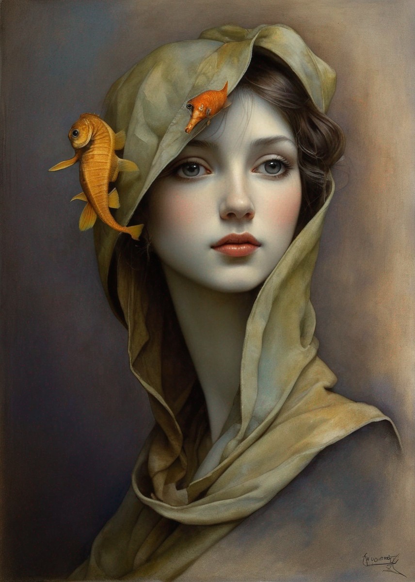A digital painting of a woman with large blue eyes, wearing a tan hat, with a goldfish perched on top, set against a muted background.