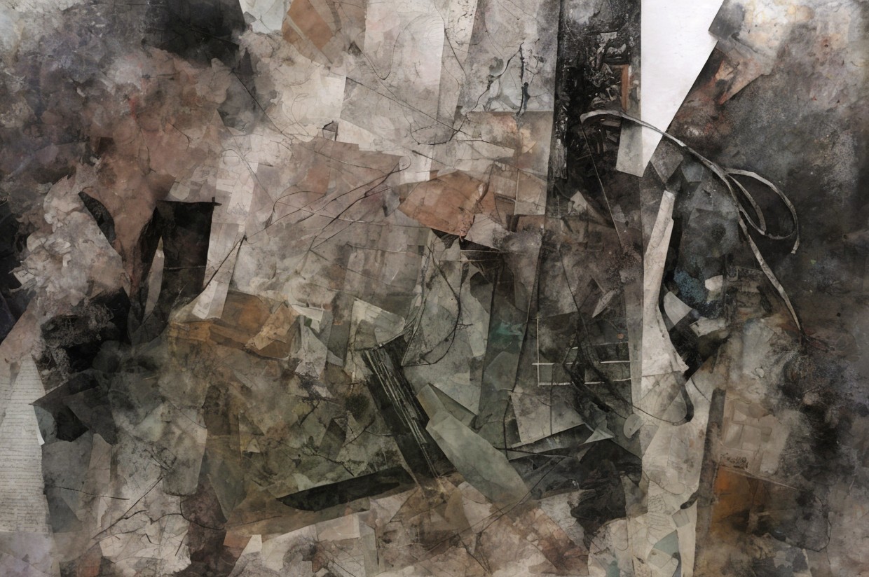 The image features a collage of textured papers and materials in a chaotic arrangement, showcasing a mix of muted colors, shapes, and abstract patterns that evoke a sense of depth and complexity.