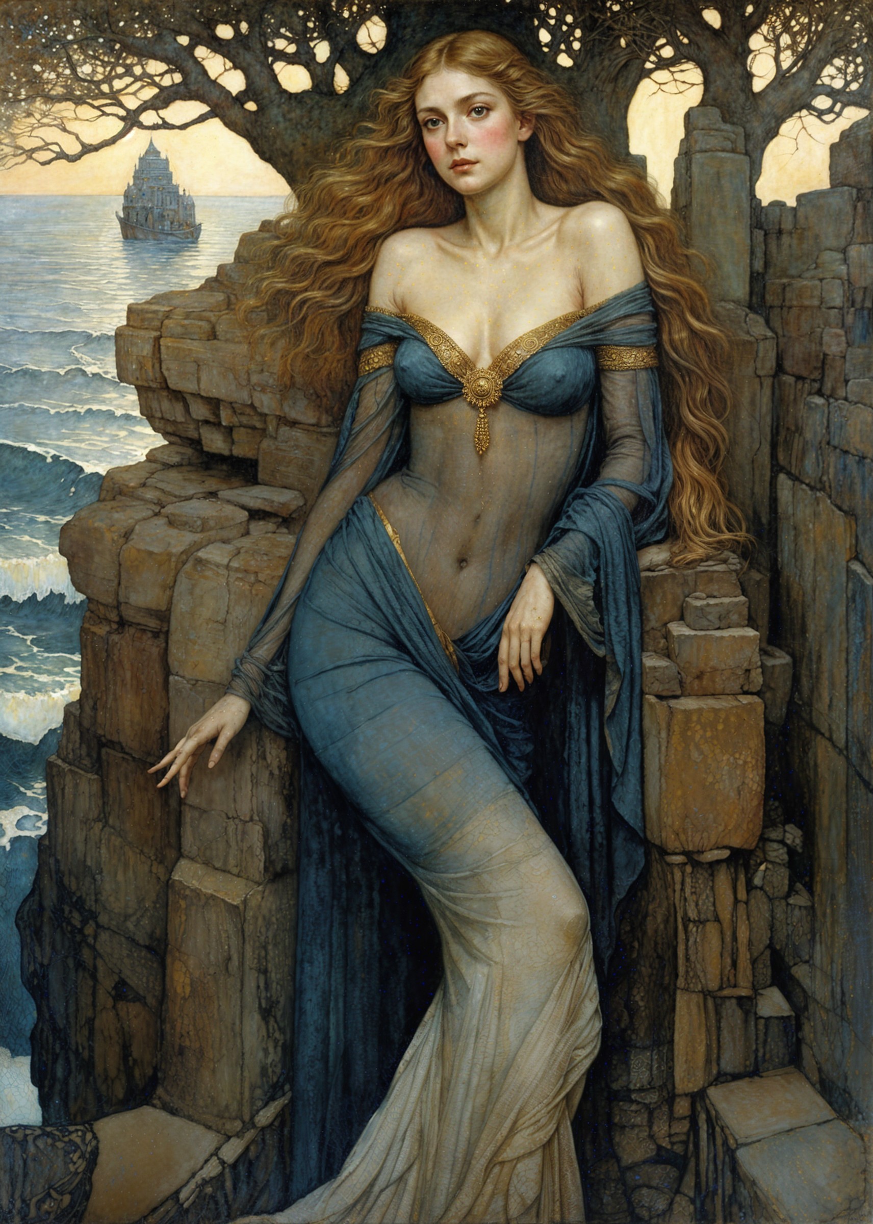A mystical woman with flowing red hair stands by rocky cliffs, draped in a translucent gown. The serene sea and distant ship create an enchanting, dreamlike atmosphere.