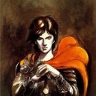 A brooding figure with tousled dark hair, wearing a dramatic red cloak. They hold a cup, exuding an air of mystery and intensity against a softly lit backdrop.