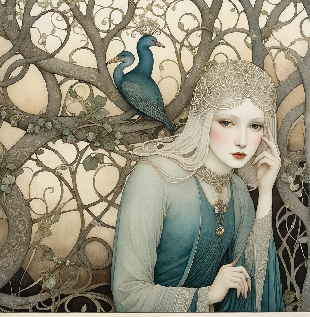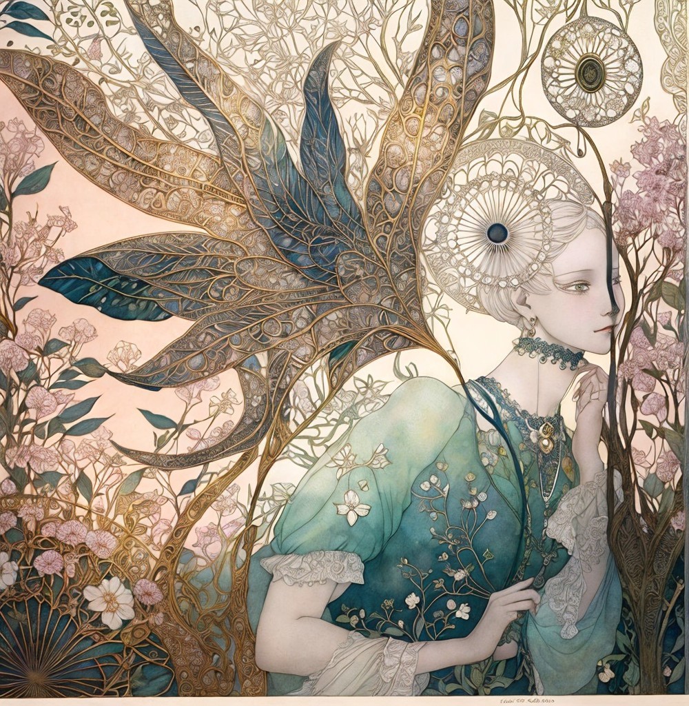 A serene woman with curly, silvery hair poses elegantly in a flowing blue gown. Surrounded by intricate floral patterns, she holds a delicate flower, exuding a timeless, ethereal beauty.
