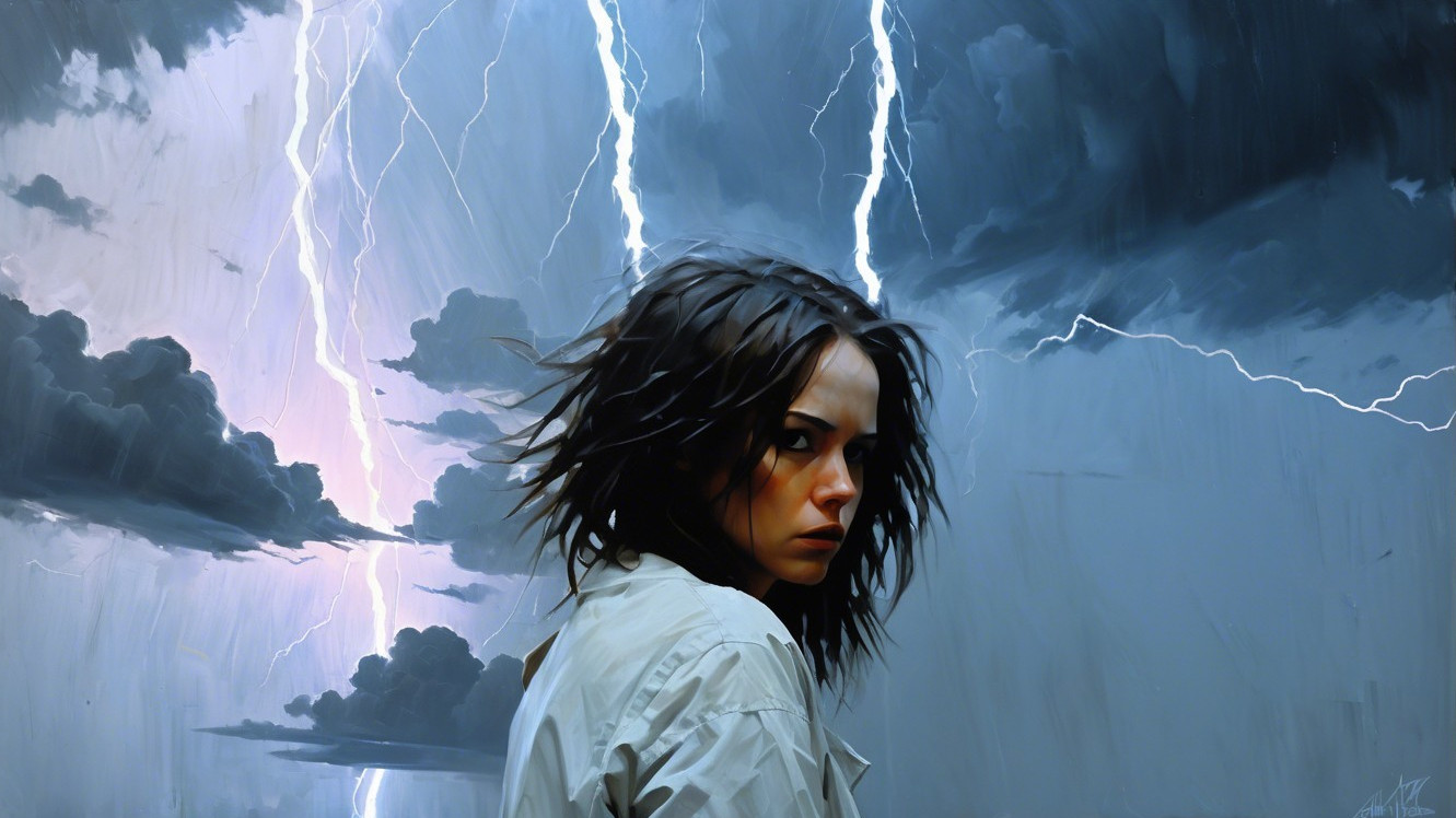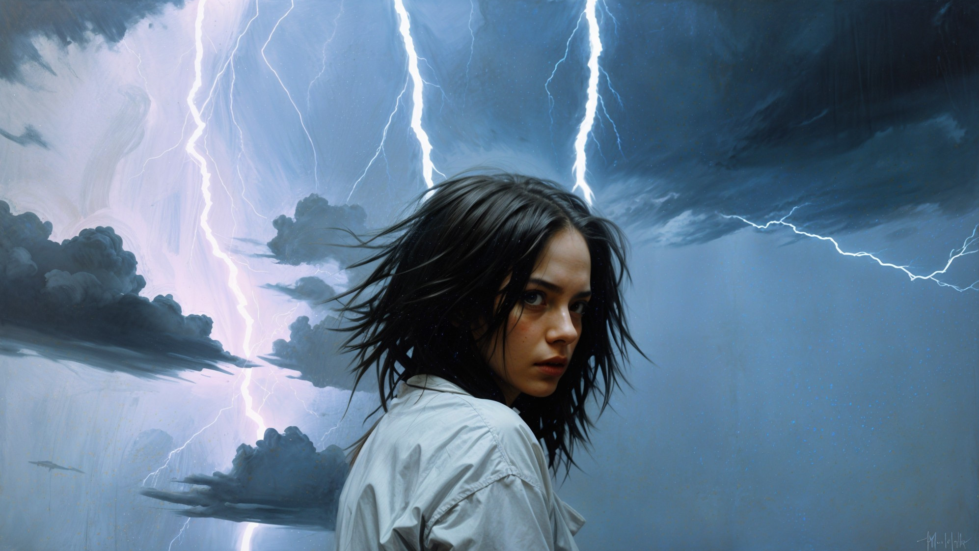 Prompt: portrait, girl, lightning storm, impasto oil painting, dark, abstract, ominous, style of Dave McKean, Jeremy Mann, Christopher Bucklow and Stephen Gammell