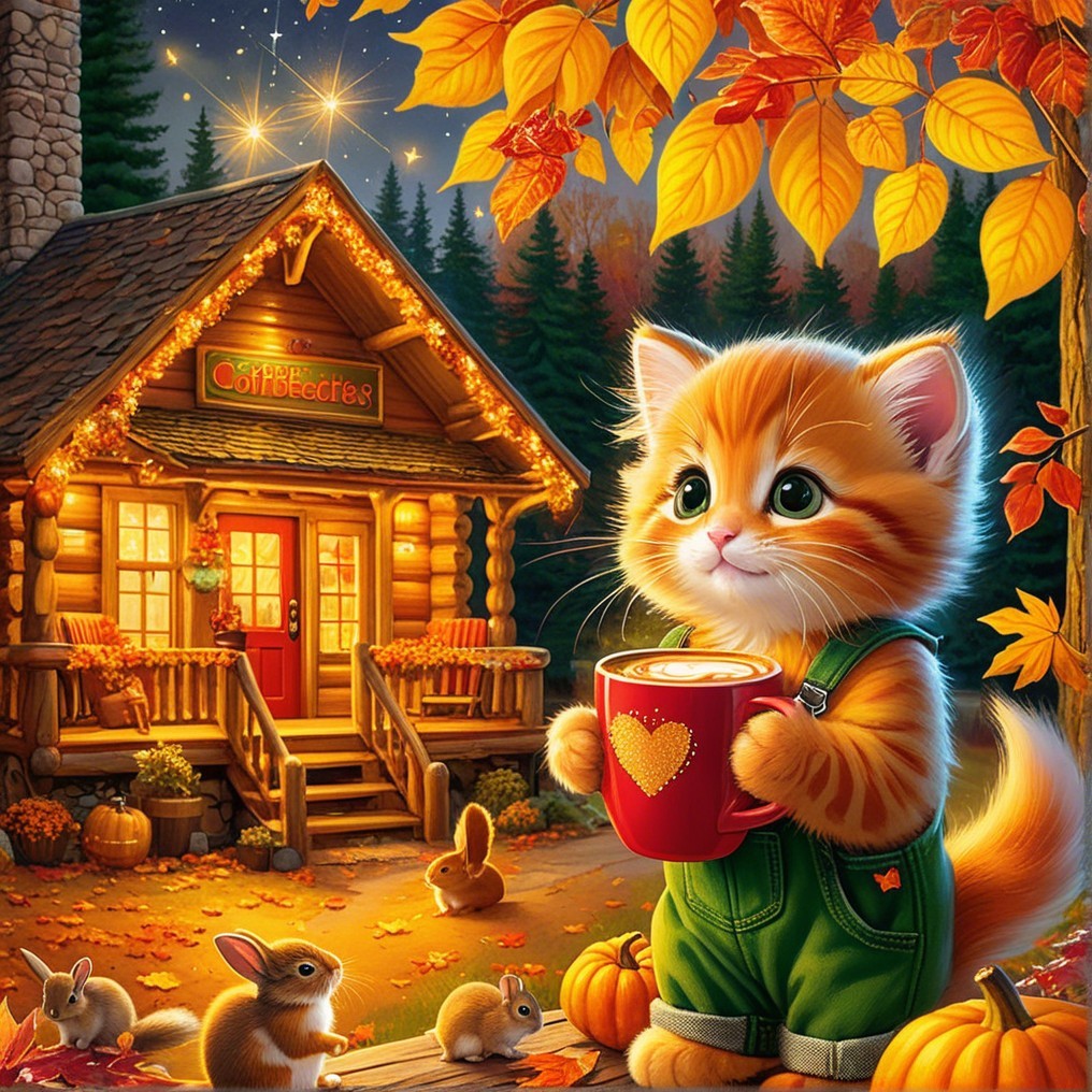 An adorable orange kitten in overalls holds a cozy mug near a charming log cabin surrounded by vibrant autumn leaves and playful rabbits, embodying a warm fall atmosphere.