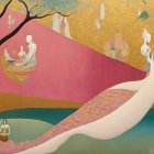 Ethereal Figures in Whimsical Pink and Gold Landscape