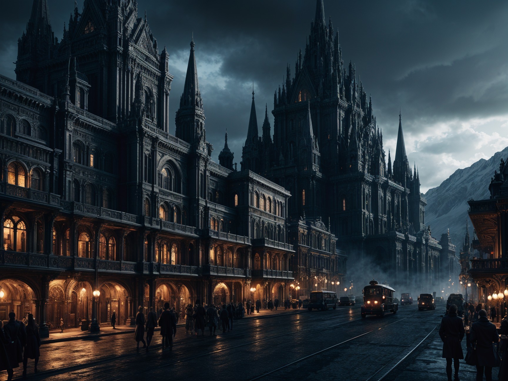 A moody, atmospheric street scene at dusk features intricate, gothic architecture. Dim lights glow from storied buildings, while shadows loom and mist envelops the cobbled street.