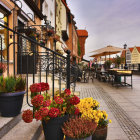 A vibrant street scene with colorful flower-adorned buildings, stone steps, and shaded outdoor seating. Soft clouds hover above, adding a whimsical touch to this charming, picturesque atmosphere.