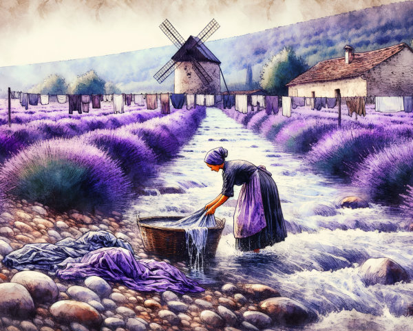 A surreal painting of a woman amidst nature with flowing hair, facing a city merging with forest under a dramatic sky.