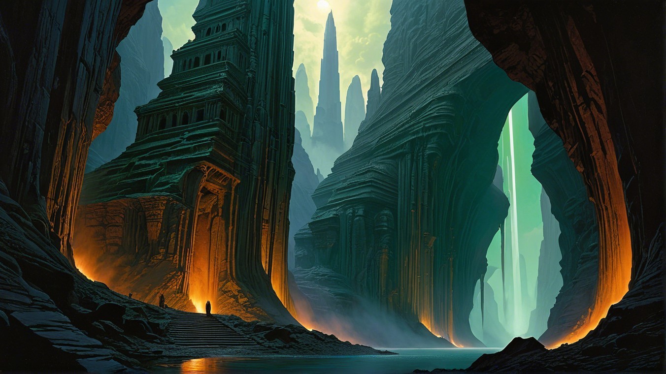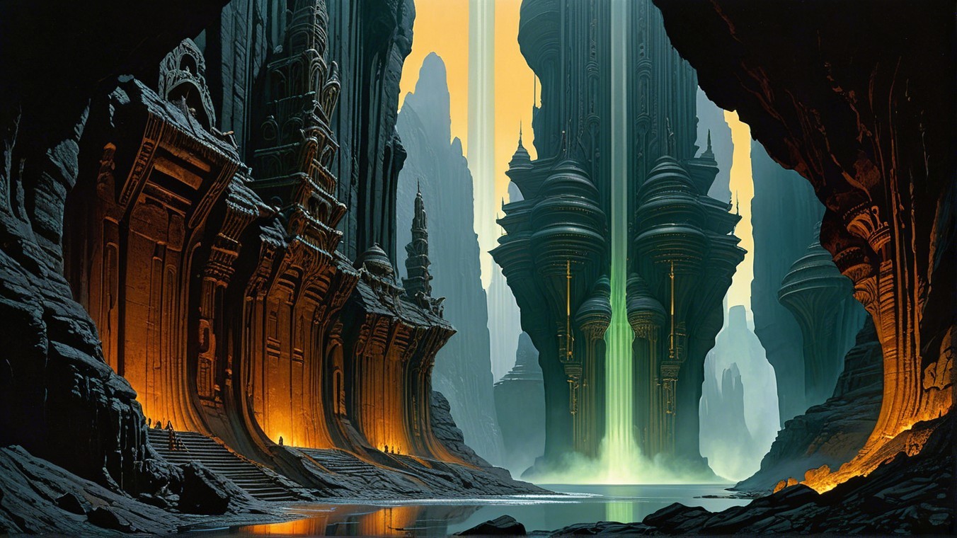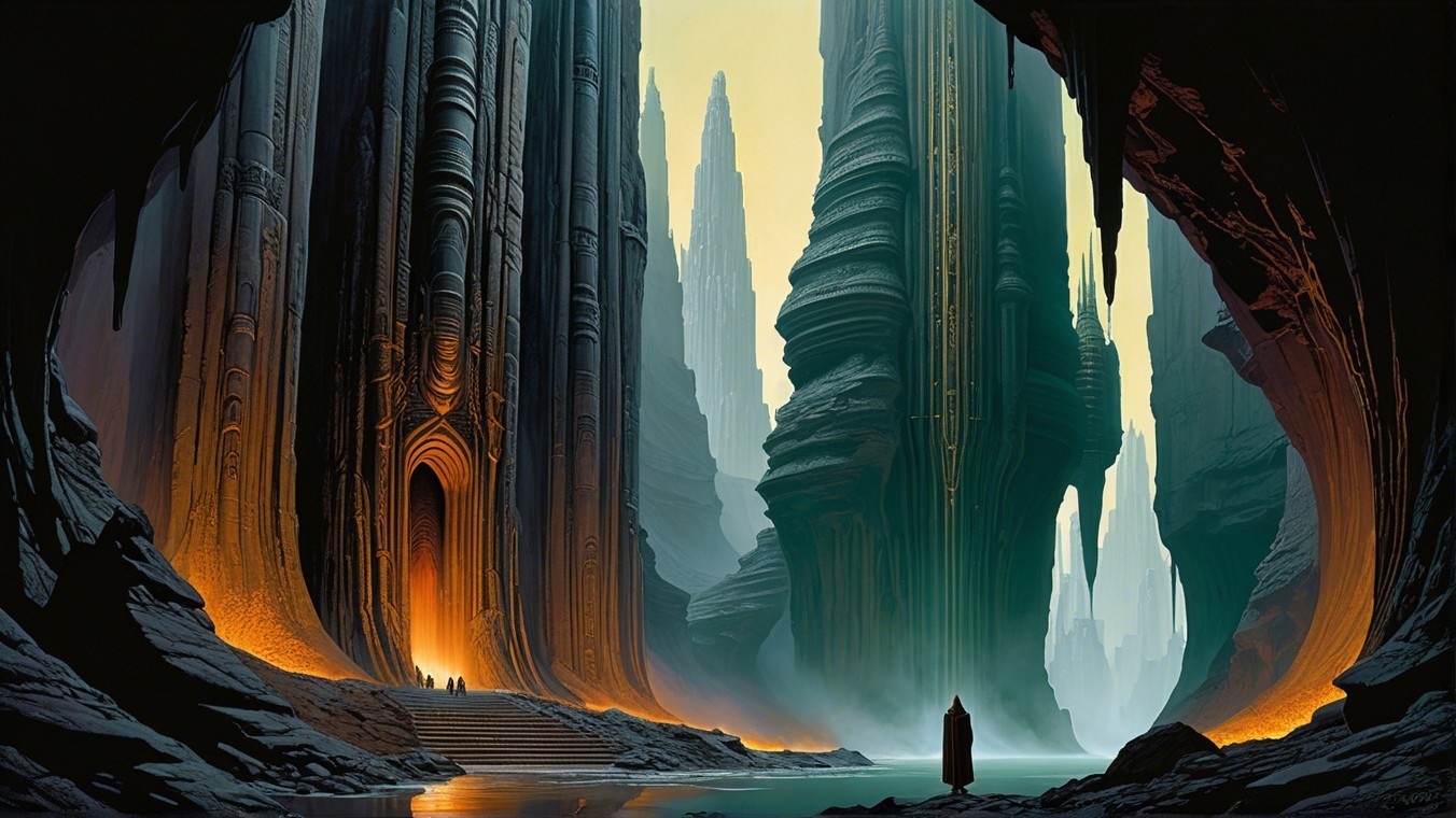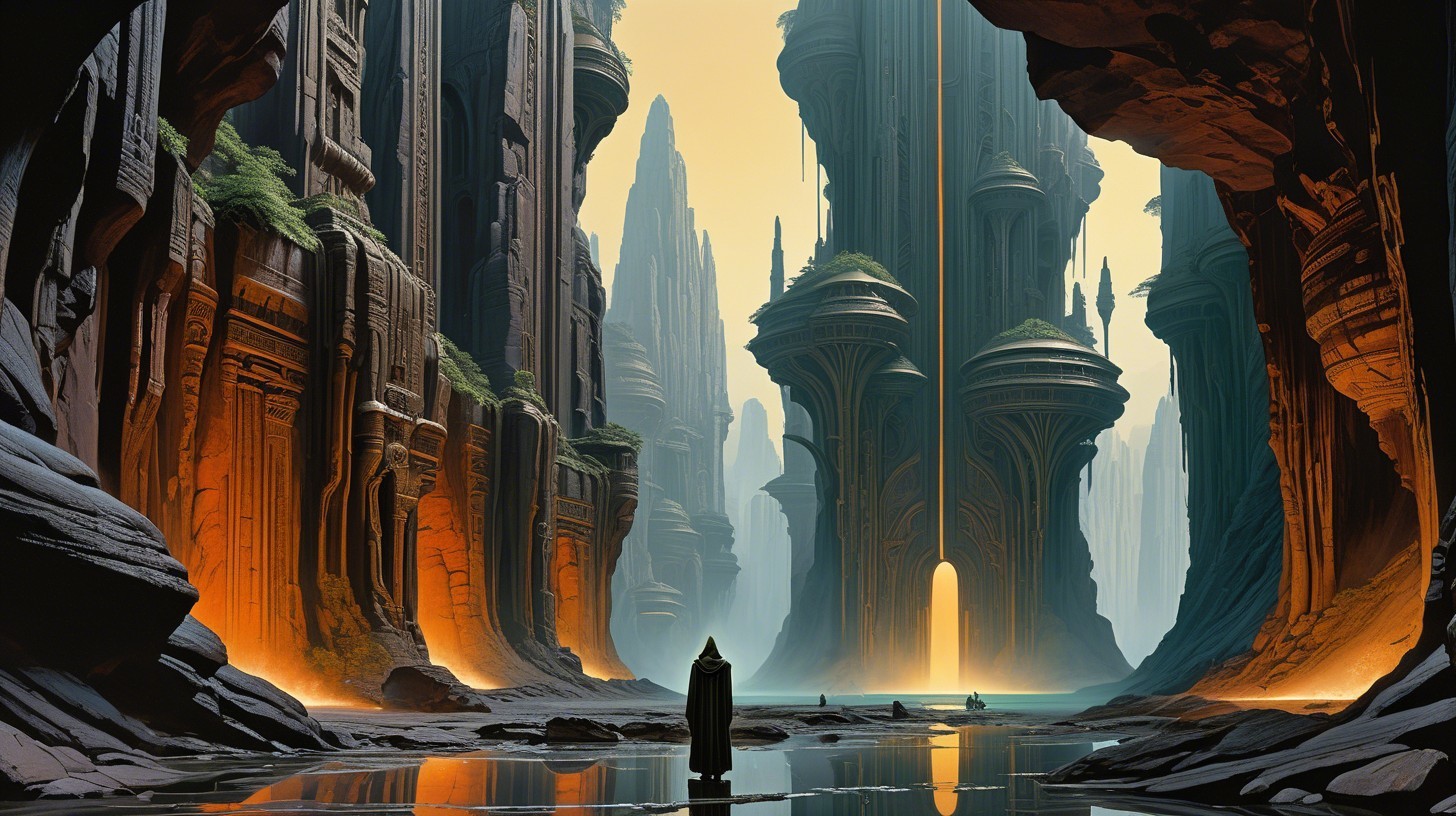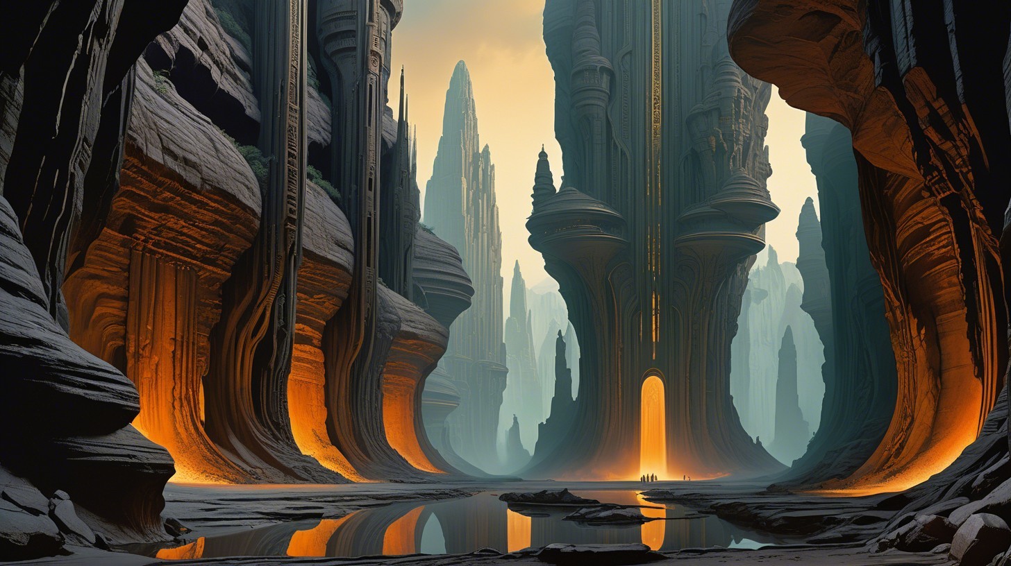 A stunning landscape featuring towering, intricately carved rock formations with glowing orange accents, reflecting in still water, set against a soft, ethereal sky.
