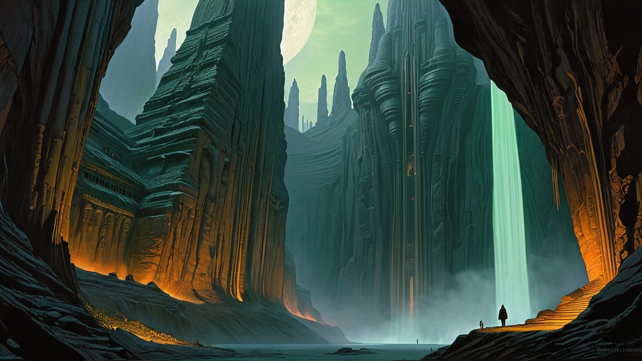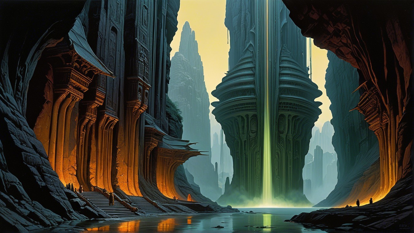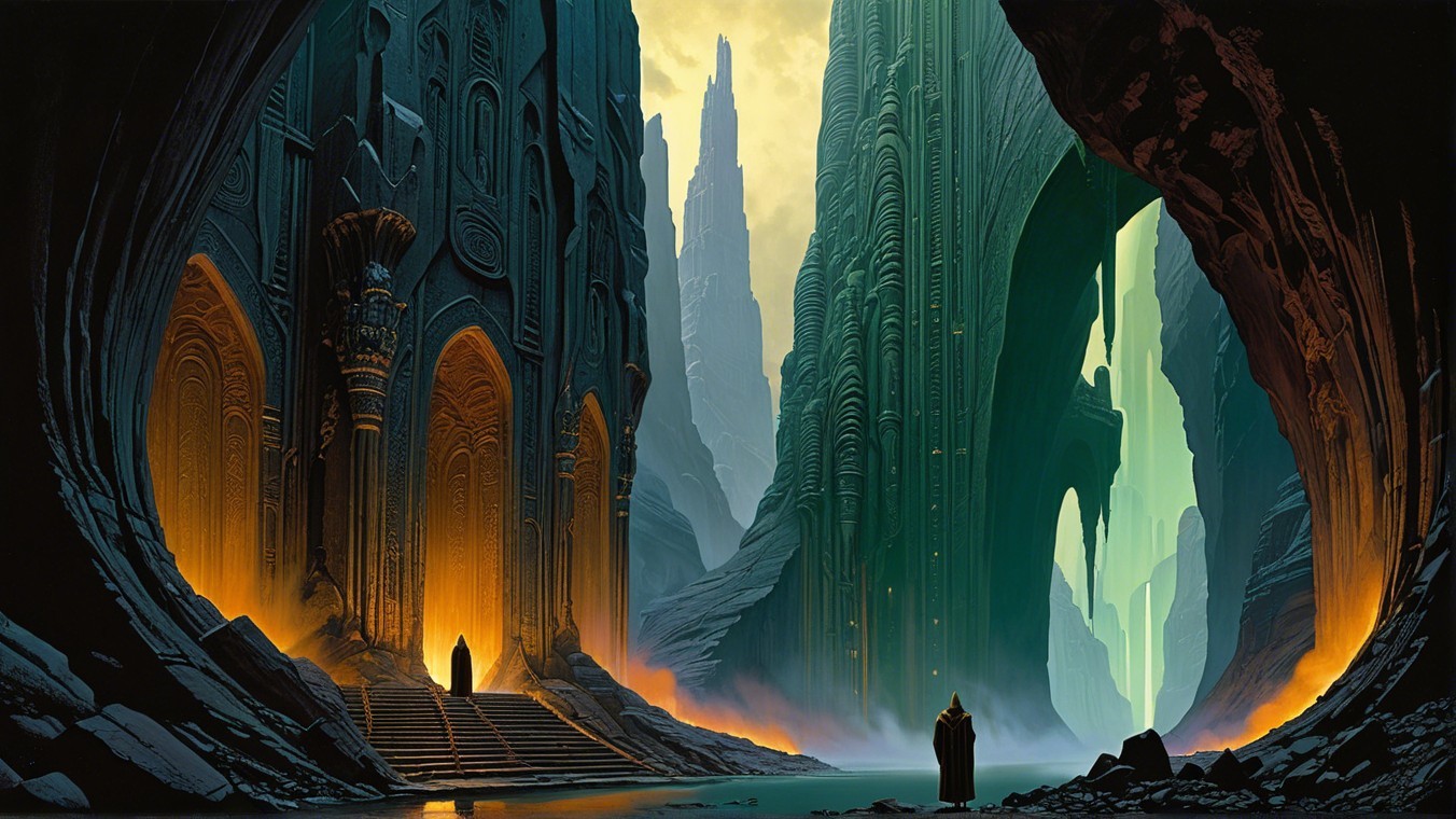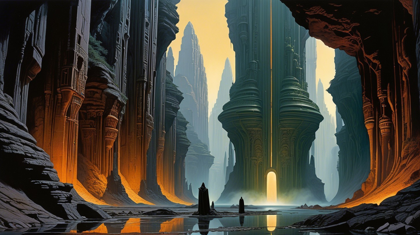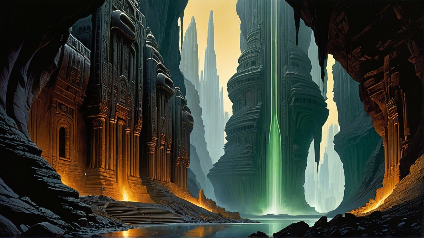 A stunning landscape featuring towering, intricately carved rock formations with glowing orange accents, reflecting in still water, set against a soft, ethereal sky.