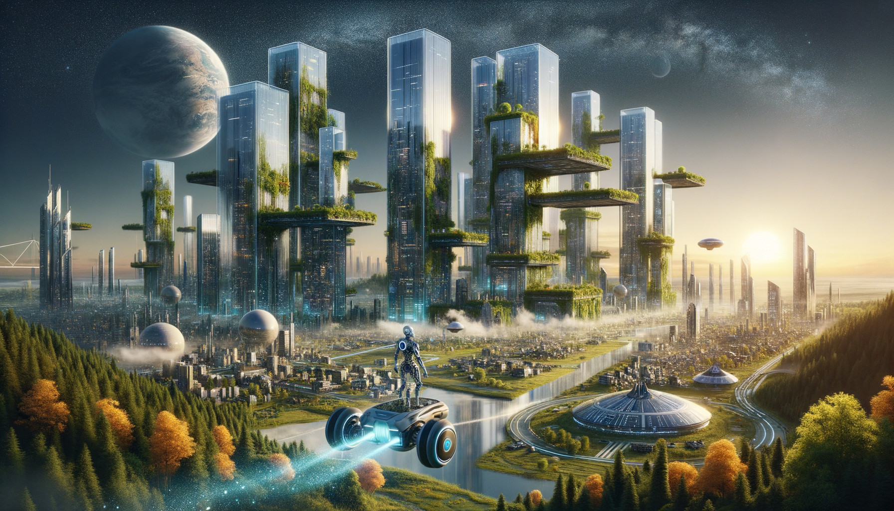 A futuristic cityscape with towering skyscrapers, lush greenery, and flying vehicles against a clear sky.