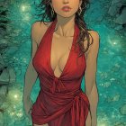 A striking portrait of a woman in a flowing red dress. She exudes confidence, with elegant accessories and a stylish hairstyle, set against an abstract blue background that enhances her allure.