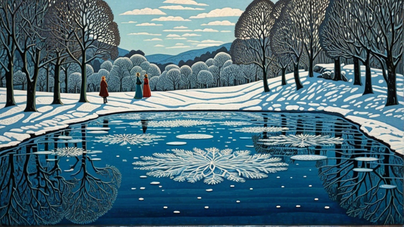 Winter Landscape with Reflective Pond and Snowflakes