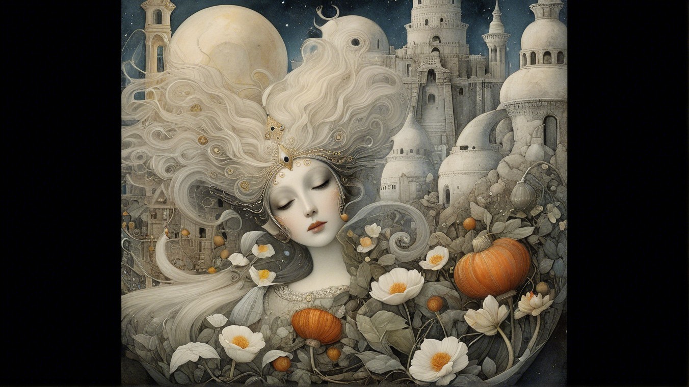 A surreal scene featuring a woman with an elaborate, dome-like hairdo surrounded by whimsical, rounded buildings and vibrant orange umbrellas. The atmosphere is dreamy and mystical.
