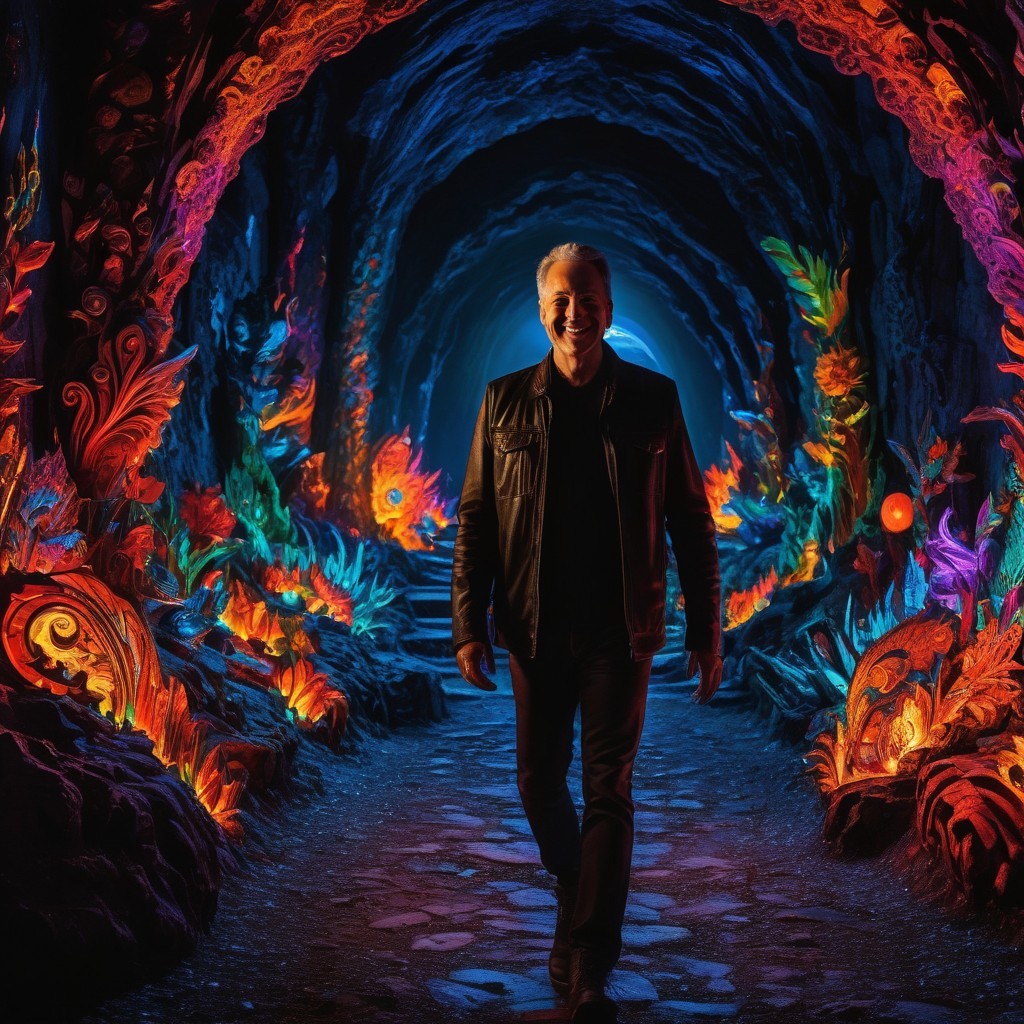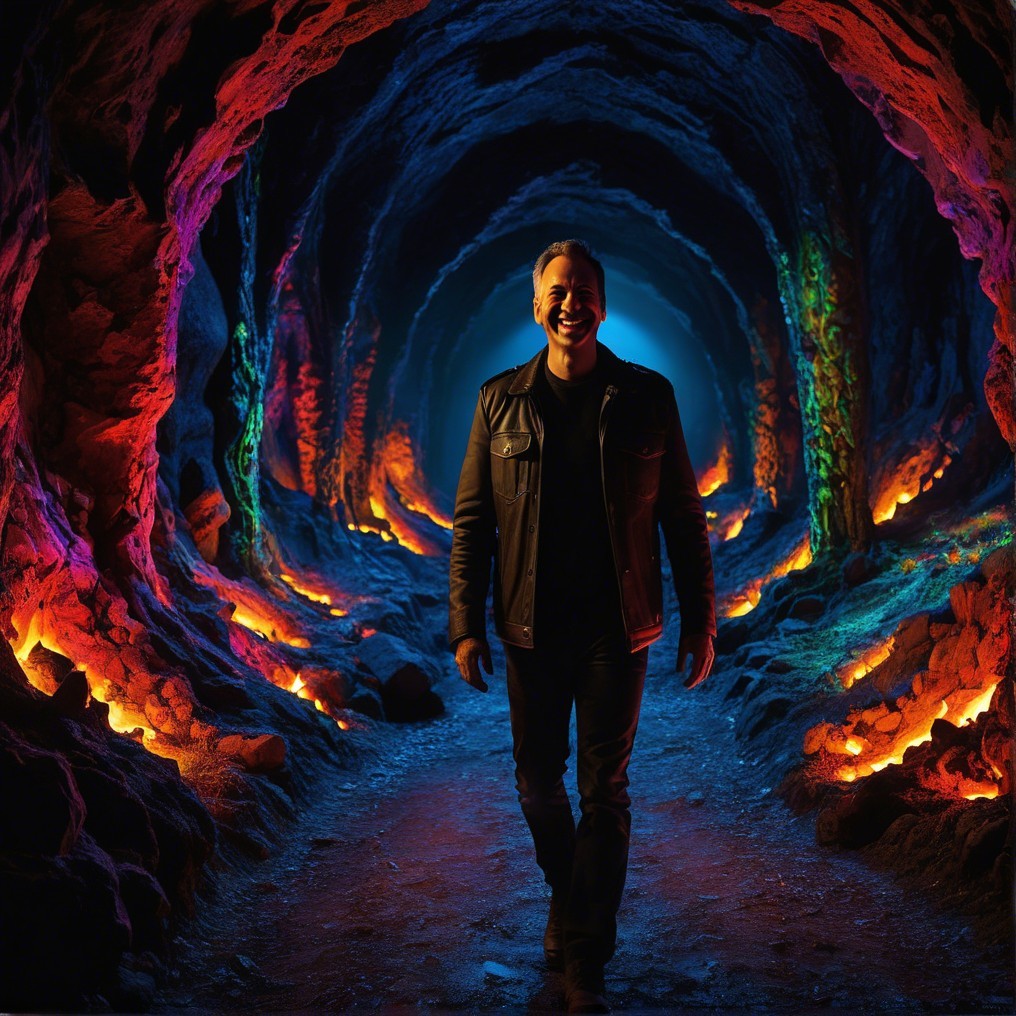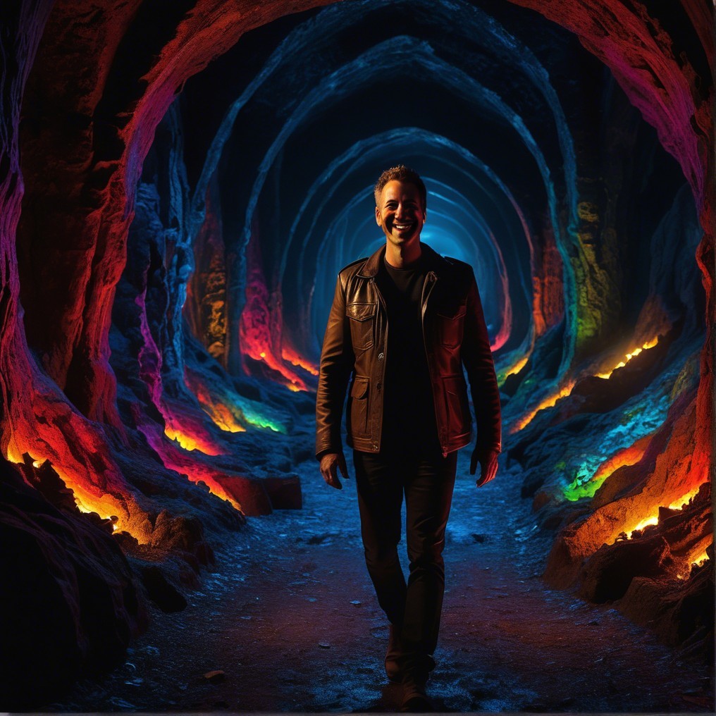 A man smiling, walking in a colorful lit-up cave tunnel with vibrant red and blue hues reflecting off the walls.