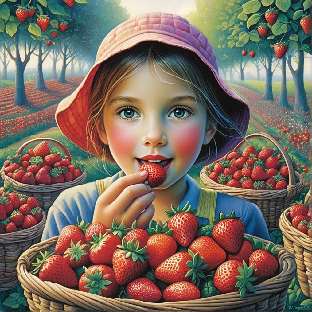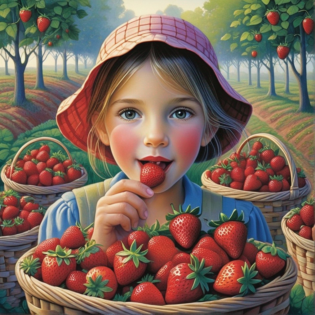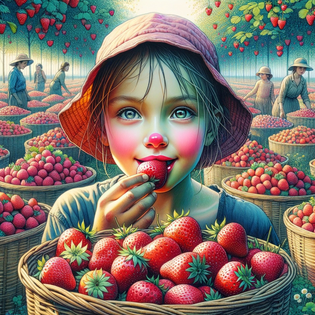 Art by Lisa Parker,Mary Blair,Laurel Burch,Sandra Boynton: Baskets full of berries, and the roads are full of children. Fields, groves, and forests smell of strawberries. the child's mouth is already like a strawberry, and the child's nose is like a strawberry. And the fingers look like they're painted sweet - we can even lick them
