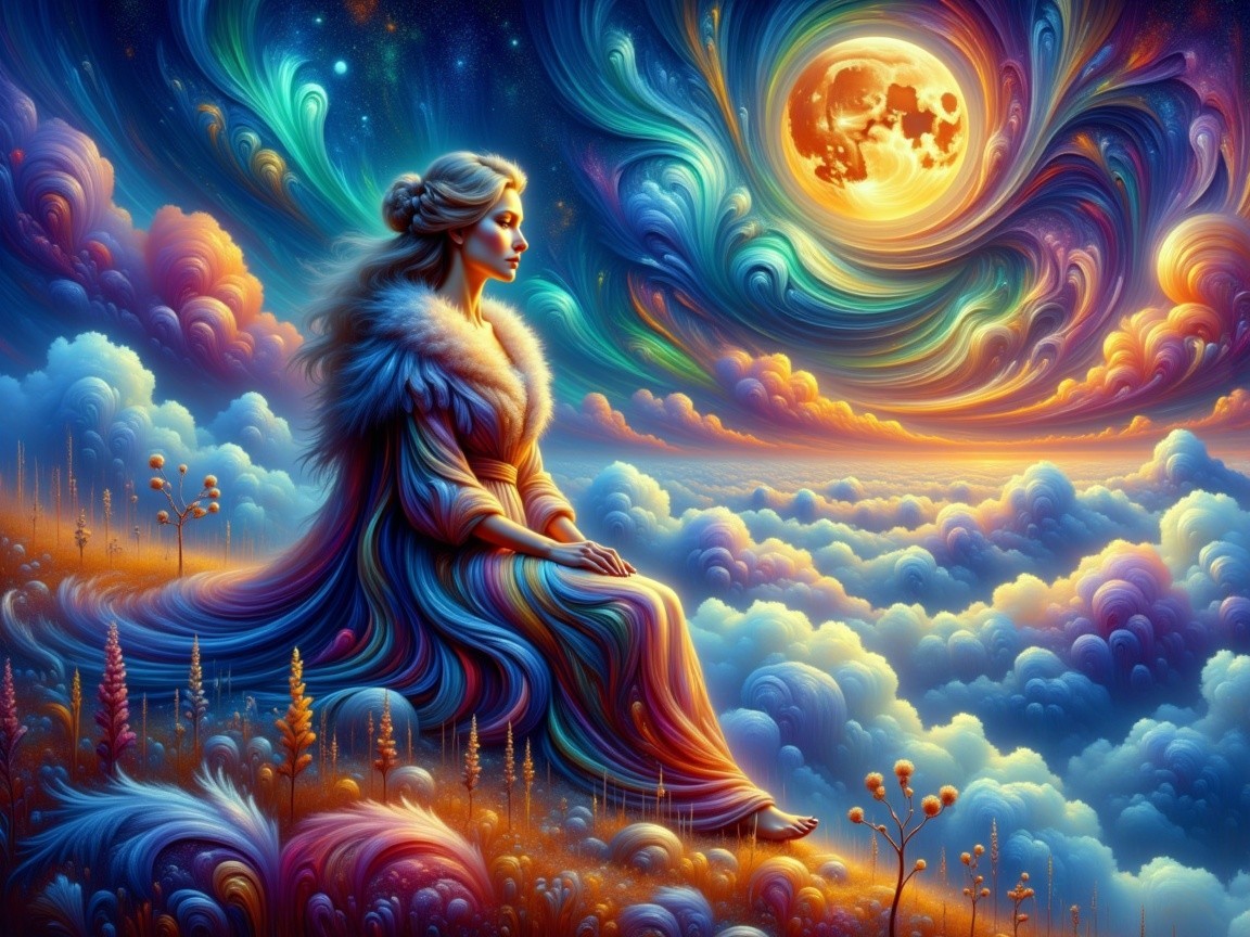 A serene woman in a flowing gown sits atop a mountain, gazing at a luminous moon. Feathers and vibrant clouds surround her, adding a mystical touch to the breathtaking landscape.