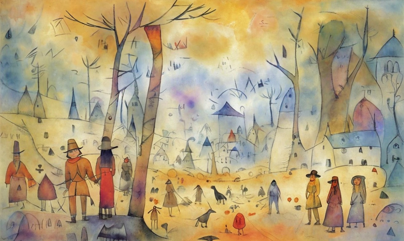 Whimsical painting of a colorful, stylized village with trees, houses, and figures resembling birds and people, under a dreamy sky.